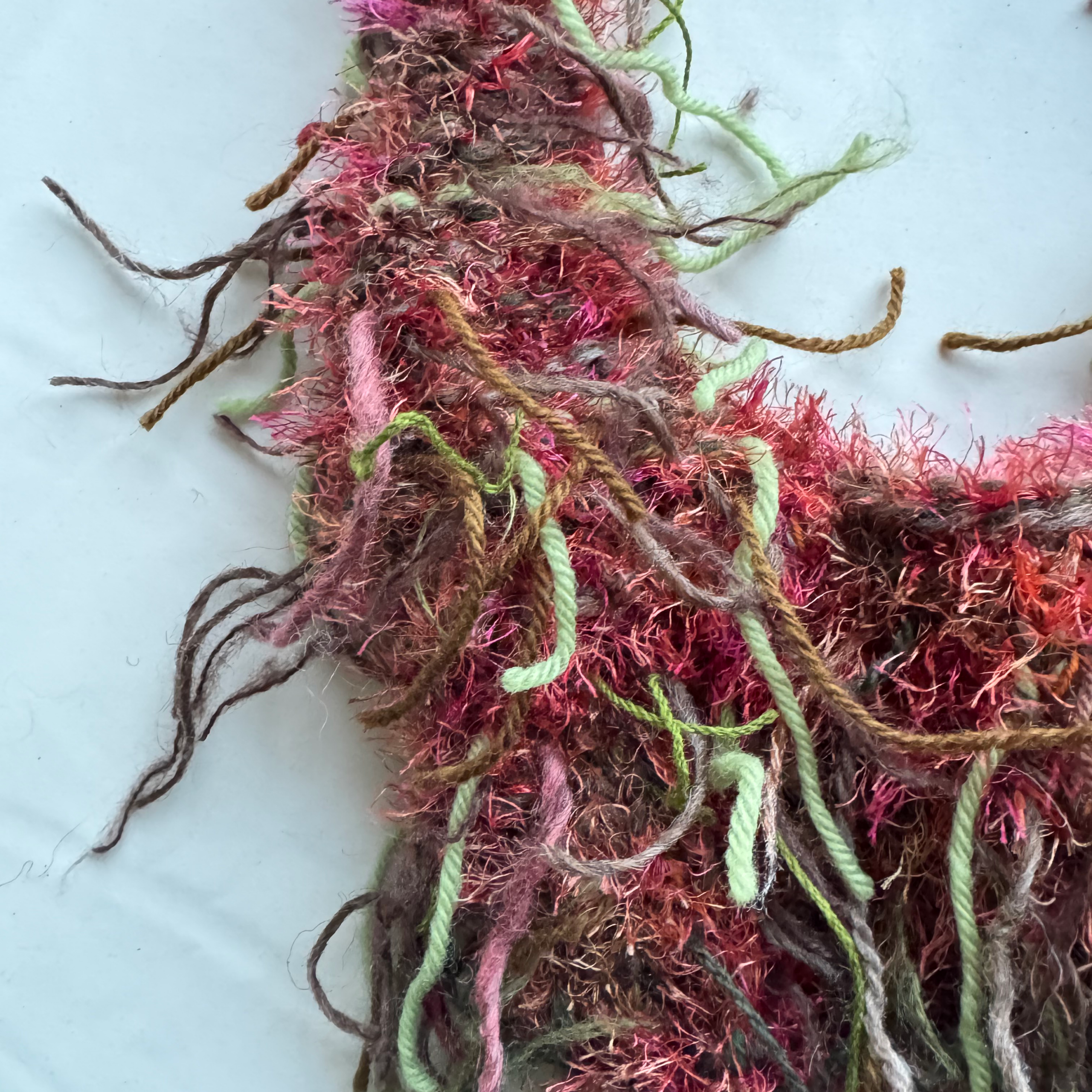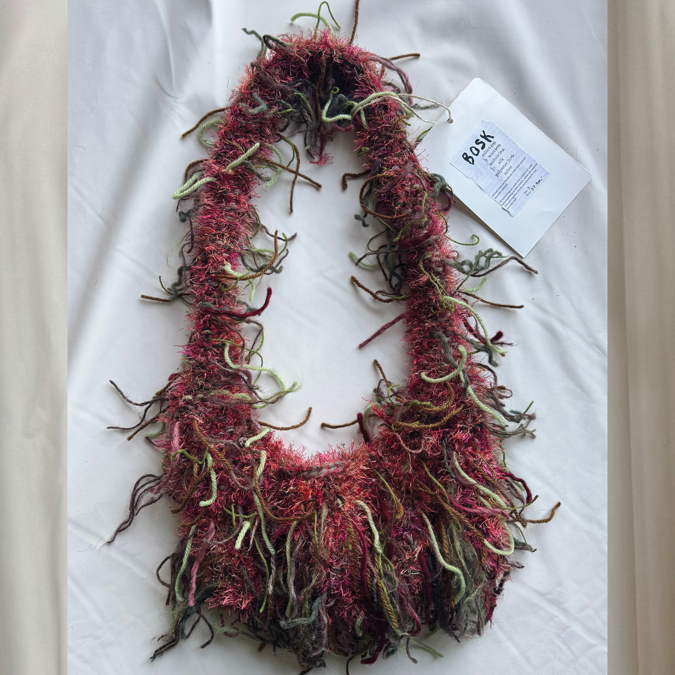 All bags are made with a mixture of scrap yarn depending on their texture, colour and material what goes together.