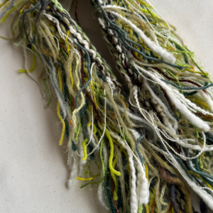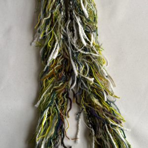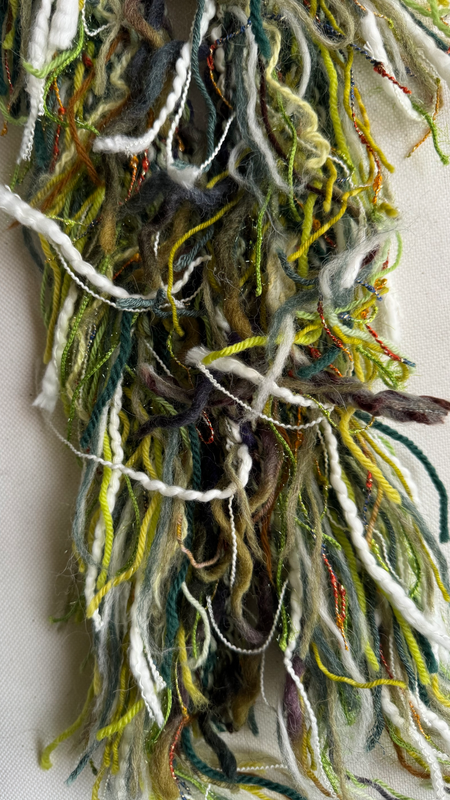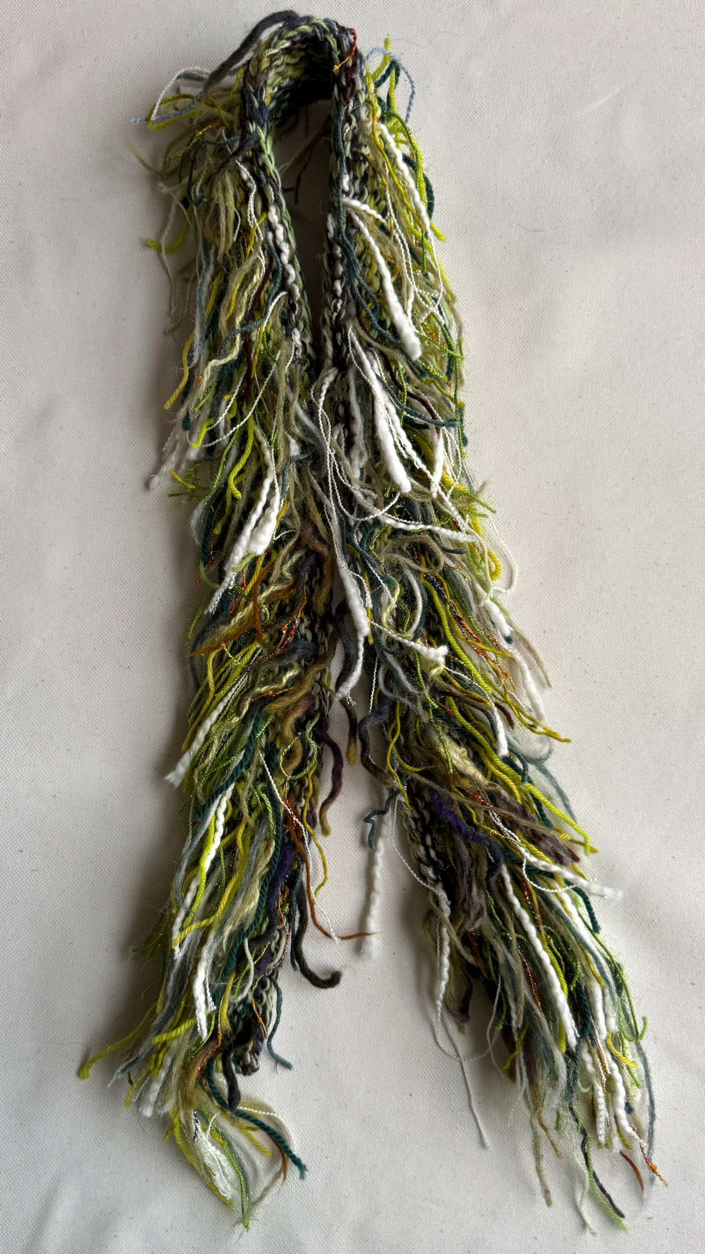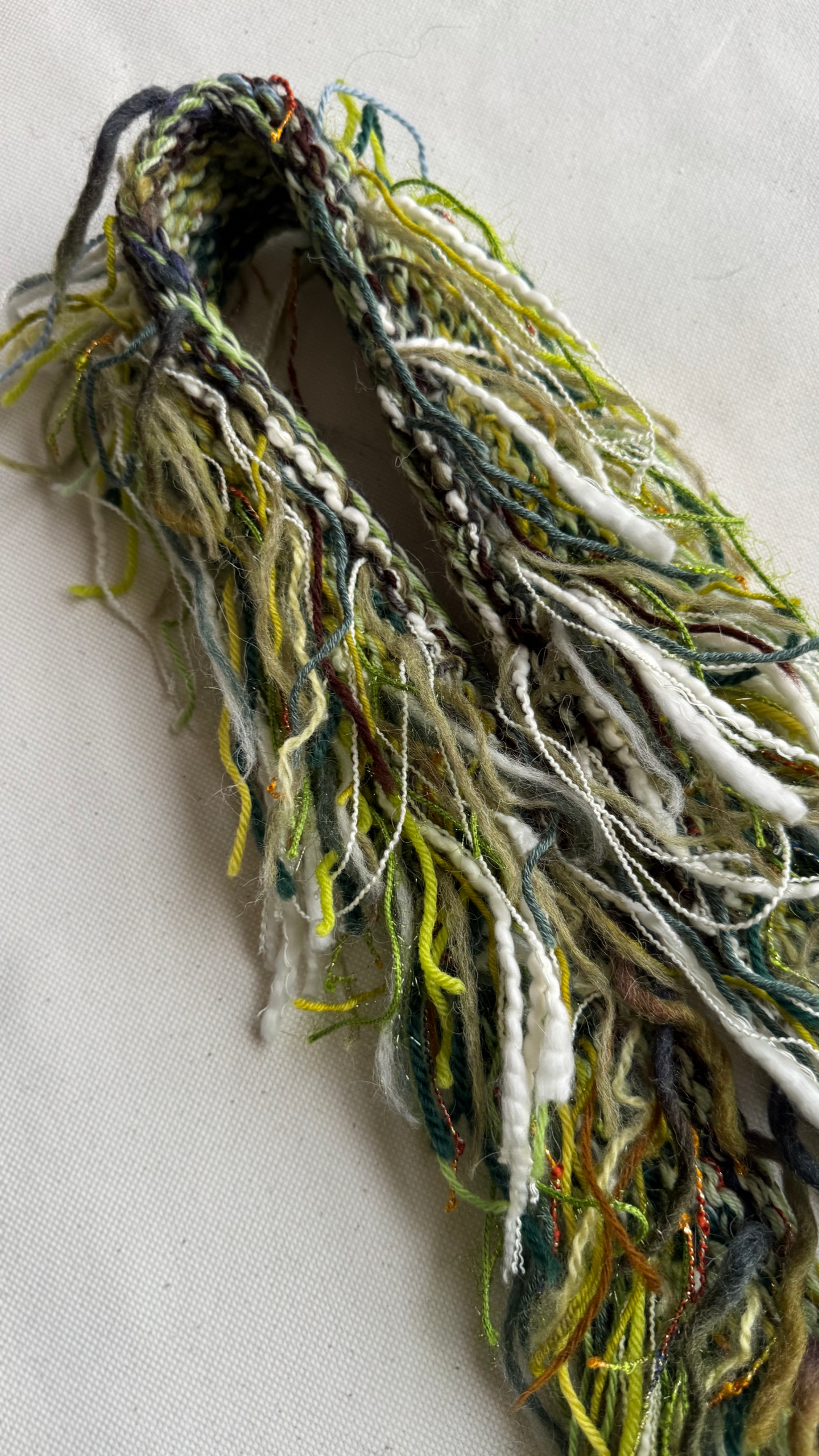 Handknitted scarf with detail from yarn scraps. All scarves are wool based and one of a kind.
