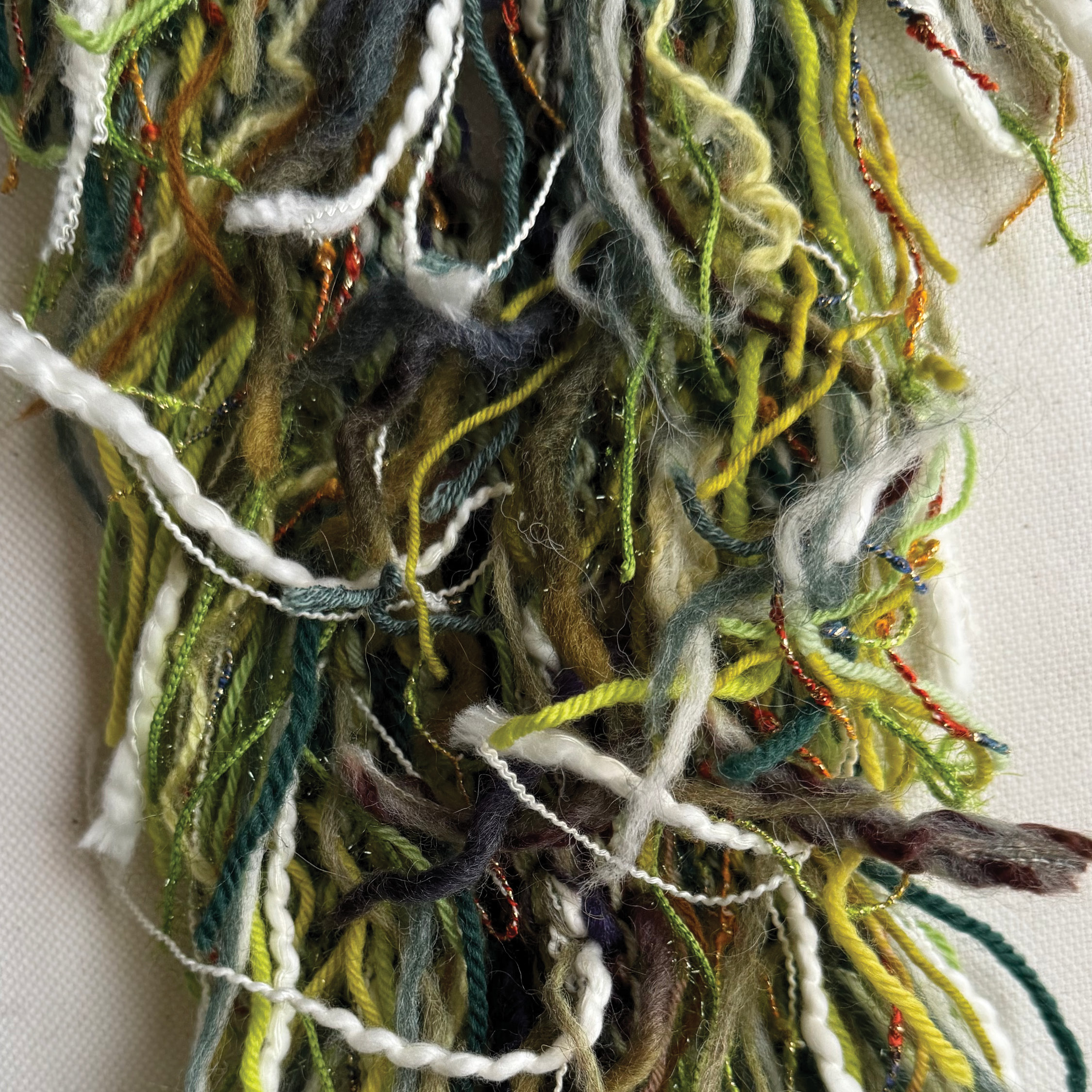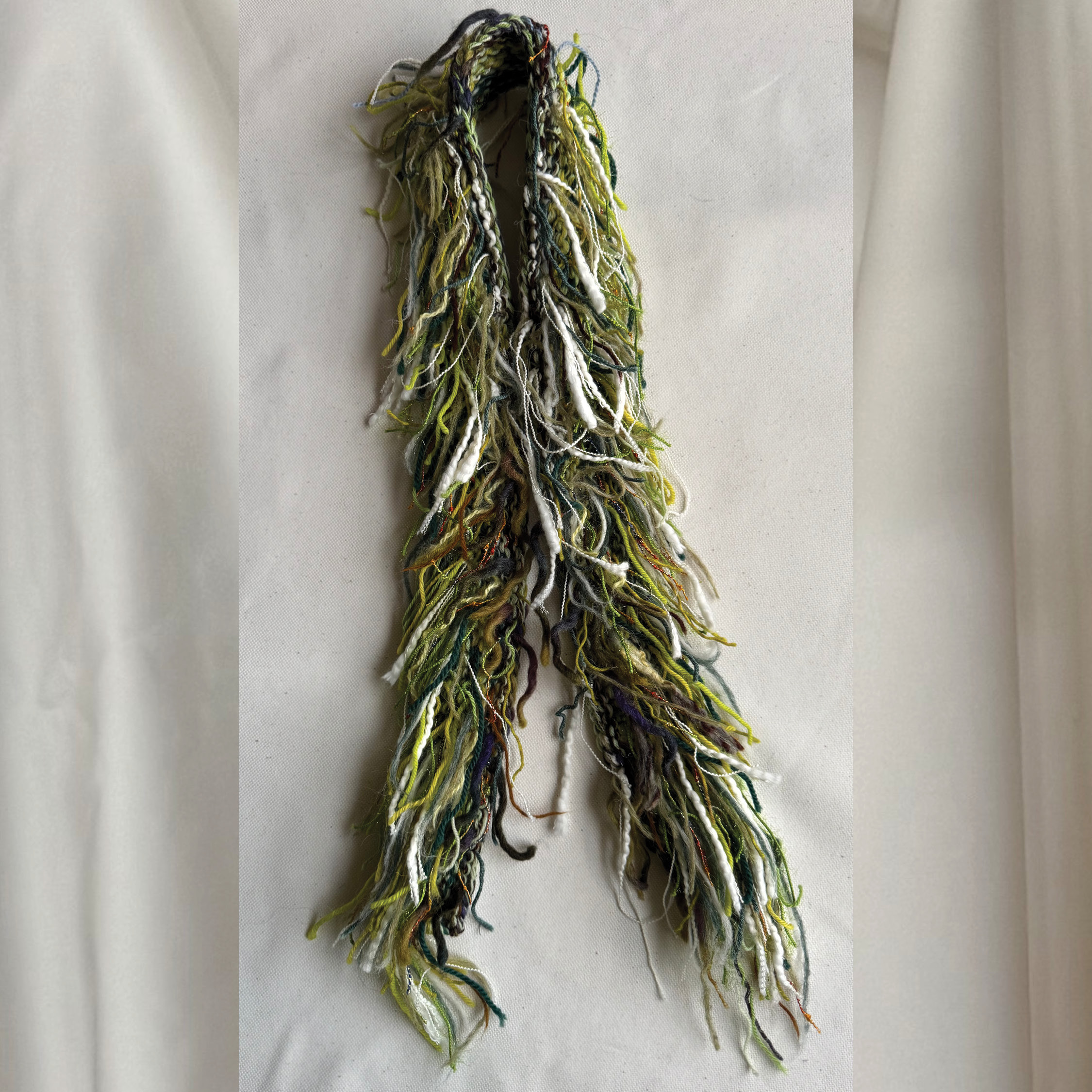 All scarves are made with a mix of scrap yarn depending on their texture, colour and material what goes together. All scarves have a wool base to keep you warm.